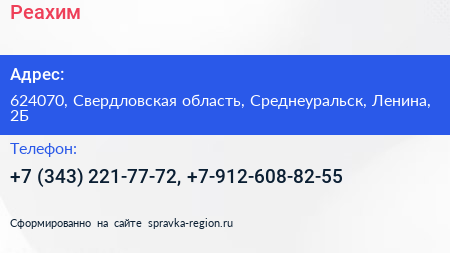 Реахим по адресу 624070, Свердловская область, Среднеуральск, Ленина, 2Б в дальнейшем Организация, размещена в следующих категориях: