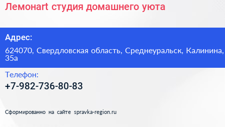 Лемонart, студия домашнего уюта по адресу 624070, Свердловская область, Среднеуральск, Калинина, 35а в дальнейшем Организация, размещена в следующих категориях: