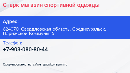 Старк, магазин спортивной одежды по адресу 624070, Свердловская область, Среднеуральск, Парижской Коммуны, 5 в дальнейшем Организация, размещена в следующих категориях: