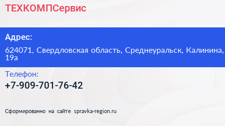 ТЕХКОМПСервис по адресу 624071, Свердловская область, Среднеуральск, Калинина, 19а в дальнейшем Организация, размещена в следующих категориях: