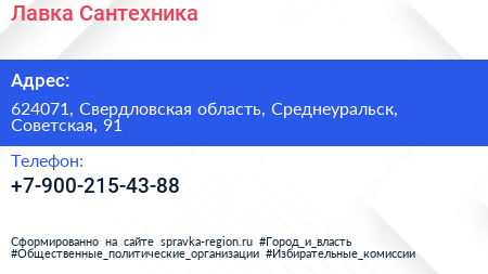 Лавка Сантехника по адресу 624071, Свердловская область, Среднеуральск, Советская, 91 в дальнейшем Организация, размещена в следующих категориях: