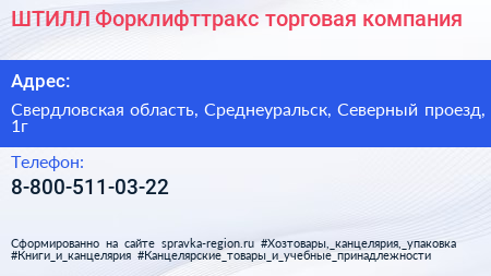 ШТИЛЛ Форклифттракс, торговая компания по адресу Свердловская область, Среднеуральск, Северный проезд, 1г в дальнейшем Организация, размещена в следующих категориях: