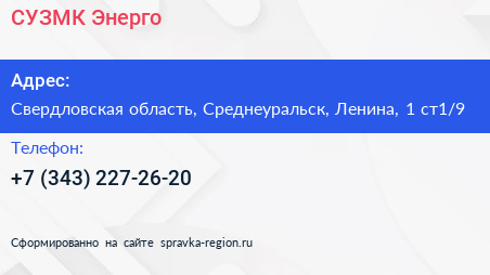 СУЗМК Энерго по адресу Свердловская область, Среднеуральск, Ленина, 1 ст1/9 в дальнейшем Организация, размещена в следующих категориях: