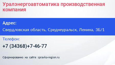 Уралэнергоавтоматика, производственная компания по адресу Свердловская область, Среднеуральск, Ленина, 3Б/1 в дальнейшем Организация, размещена в следующих категориях: