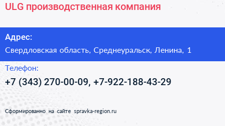 ULG, производственная компания по адресу Свердловская область, Среднеуральск, Ленина, 1 в дальнейшем Организация, размещена в следующих категориях: