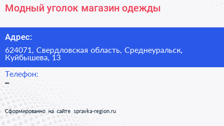 Модный уголок, магазин одежды по адресу 624071, Свердловская область, Среднеуральск, Куйбышева, 13 в дальнейшем Организация, размещена в следующих категориях: