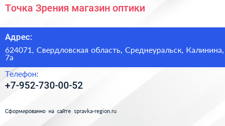 Точка Зрения, магазин оптики по адресу 624071, Свердловская область, Среднеуральск, Калинина, 7а в дальнейшем Организация, размещена в следующих категориях: