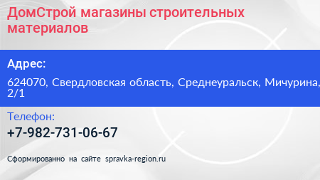 ДомСтрой, магазины строительных материалов по адресу 624070, Свердловская область, Среднеуральск, Мичурина, 2/1 в дальнейшем Организация, размещена в следующих категориях: