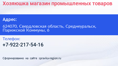 Хозяюшка, магазин промышленных товаров по адресу 624070, Свердловская область, Среднеуральск, Парижской Коммуны, 6 в дальнейшем Организация, размещена в следующих категориях: