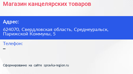 Магазин канцелярских товаров по адресу 624070, Свердловская область, Среднеуральск, Парижской Коммуны, 5 в дальнейшем Организация, размещена в следующих категориях: