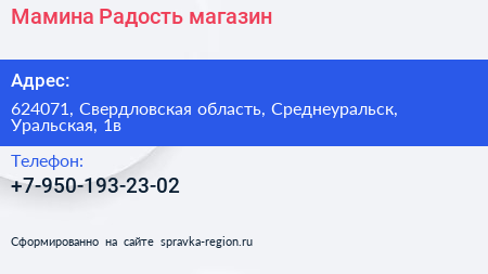 Мамина Радость, магазин по адресу 624071, Свердловская область, Среднеуральск, Уральская, 1в в дальнейшем Организация, размещена в следующих категориях: