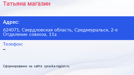 Татьяна, магазин по адресу 624071, Свердловская область, Среднеуральск, 2-е Отделение совхоза, 11а в дальнейшем Организация, размещена в следующих категориях: