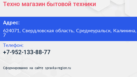 Техно, магазин бытовой техники по адресу 624071, Свердловская область, Среднеуральск, Калинина, 7 в дальнейшем Организация, размещена в следующих категориях:
