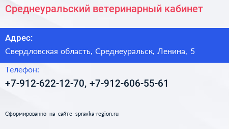 Среднеуральский ветеринарный кабинет по адресу Свердловская область, Среднеуральск, Ленина, 5 в дальнейшем Организация, размещена в следующих категориях: