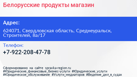 Белорусские продукты, магазин по адресу 624071, Свердловская область, Среднеуральск, Строителей, 8а/17 в дальнейшем Организация, размещена в следующих категориях: