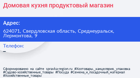 Домовая кухня, продуктовый магазин по адресу 624071, Свердловская область, Среднеуральск, Лермонтова, 9 в дальнейшем Организация, размещена в следующих категориях: