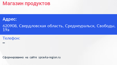 Магазин продуктов по адресу 620908, Свердловская область, Среднеуральск, Свободы, 19а в дальнейшем Организация, размещена в следующих категориях: