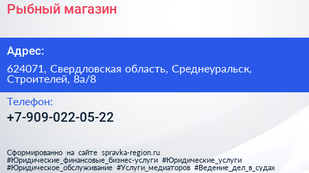 Рыбный магазин по адресу 624071, Свердловская область, Среднеуральск, Строителей, 8а/8 в дальнейшем Организация, размещена в следующих категориях:
