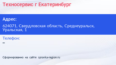 Техносервис, г. Екатеринбург по адресу 624071, Свердловская область, Среднеуральск, Уральская, 1 в дальнейшем Организация, размещена в следующих категориях: