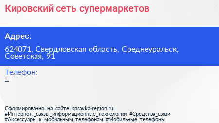 Кировский, сеть супермаркетов по адресу 624071, Свердловская область, Среднеуральск, Советская, 91 в дальнейшем Организация, размещена в следующих категориях: