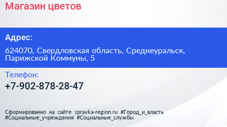 Магазин цветов по адресу 624070, Свердловская область, Среднеуральск, Парижской Коммуны, 5 в дальнейшем Организация, размещена в следующих категориях: