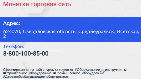 Монетка, торговая сеть по адресу 624070, Свердловская область, Среднеуральск, Исетская, 2 в дальнейшем Организация, размещена в следующих категориях: