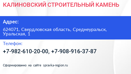 КАЛИНОВСКИЙ СТРОИТЕЛЬНЫЙ КАМЕНЬ по адресу 624071, Свердловская область, Среднеуральск, Уральская, 1 в дальнейшем Организация, размещена в следующих категориях:
