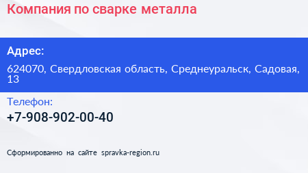 Компания по сварке металла по адресу 624070, Свердловская область, Среднеуральск, Садовая, 13 в дальнейшем Организация, размещена в следующих категориях: