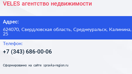 VELES, агентство недвижимости по адресу 624070, Свердловская область, Среднеуральск, Калинина, 25 в дальнейшем Организация, размещена в следующих категориях: