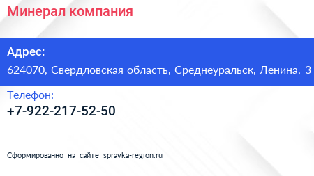 Минерал, компания по адресу 624070, Свердловская область, Среднеуральск, Ленина, 3 в дальнейшем Организация, размещена в следующих категориях: