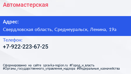 Автомастерская по адресу Свердловская область, Среднеуральск, Ленина, 19а в дальнейшем Организация, размещена в следующих категориях: