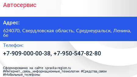 Автосервис по адресу 624070, Свердловская область, Среднеуральск, Ленина, 6е в дальнейшем Организация, размещена в следующих категориях: