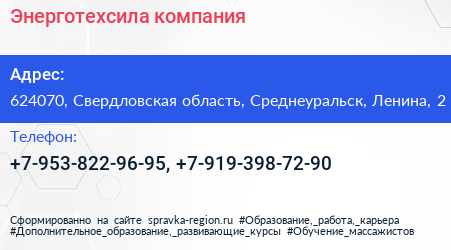 Энерготехсила, компания по адресу 624070, Свердловская область, Среднеуральск, Ленина, 2 в дальнейшем Организация, размещена в следующих категориях:
