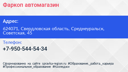 Фаркоп, автомагазин по адресу 624071, Свердловская область, Среднеуральск, Советская, 45 в дальнейшем Организация, размещена в следующих категориях: