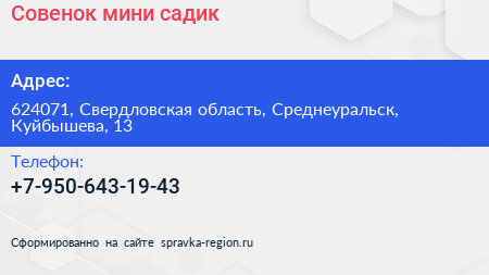 Совенок, мини-садик по адресу 624071, Свердловская область, Среднеуральск, Куйбышева, 13 в дальнейшем Организация, размещена в следующих категориях: