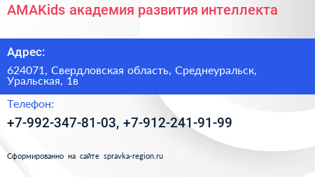 AMAKids, академия развития интеллекта по адресу 624071, Свердловская область, Среднеуральск, Уральская, 1в в дальнейшем Организация, размещена в следующих категориях: