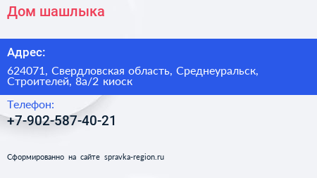Дом шашлыка по адресу 624071, Свердловская область, Среднеуральск, Строителей, 8а/2 киоск в дальнейшем Организация, размещена в следующих категориях: