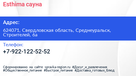 Esthima, сауна по адресу 624071, Свердловская область, Среднеуральск, Строителей, 6а в дальнейшем Организация, размещена в следующих категориях:
