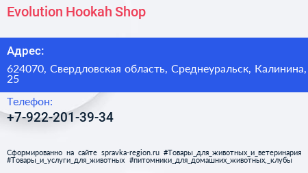 Evolution Hookah Shop по адресу 624070, Свердловская область, Среднеуральск, Калинина, 25 в дальнейшем Организация, размещена в следующих категориях: