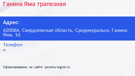 Ганина Яма, трапезная по адресу 620086, Свердловская область, Среднеуральск, Ганина Яма, 16 в дальнейшем Организация, размещена в следующих категориях: