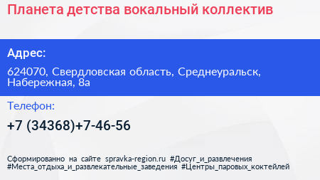 Планета детства, вокальный коллектив по адресу 624070, Свердловская область, Среднеуральск, Набережная, 8а в дальнейшем Организация, размещена в следующих категориях: