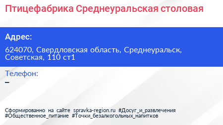 Птицефабрика Среднеуральская, столовая по адресу 624070, Свердловская область, Среднеуральск, Советская, 110 ст1 в дальнейшем Организация, размещена в следующих категориях: