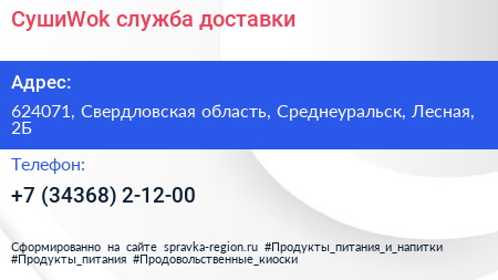 СушиWok, служба доставки по адресу 624071, Свердловская область, Среднеуральск, Лесная, 2Б в дальнейшем Организация, размещена в следующих категориях:
