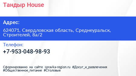 Тандыр House по адресу 624071, Свердловская область, Среднеуральск, Строителей, 8а/2 в дальнейшем Организация, размещена в следующих категориях:
