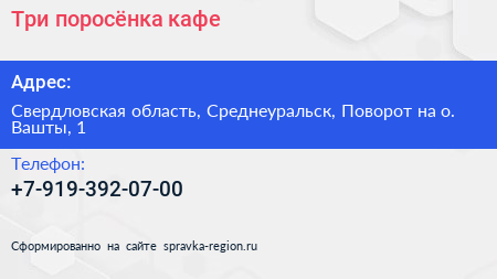 Три поросёнка, кафе по адресу Свердловская область, Среднеуральск, Поворот на о. Вашты, 1 в дальнейшем Организация, размещена в следующих категориях: