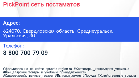 PickPoint, сеть постаматов по адресу 624070, Свердловская область, Среднеуральск, Уральская, 30 в дальнейшем Организация, размещена в следующих категориях: