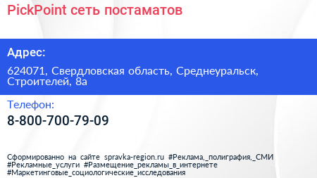 PickPoint, сеть постаматов по адресу 624071, Свердловская область, Среднеуральск, Строителей, 8а в дальнейшем Организация, размещена в следующих категориях: