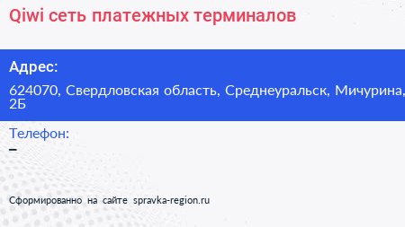 Qiwi, сеть платежных терминалов по адресу 624070, Свердловская область, Среднеуральск, Мичурина, 2Б в дальнейшем Организация, размещена в следующих категориях: