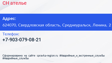 СН, ателье по адресу 624070, Свердловская область, Среднеуральск, Ленина, 2 в дальнейшем Организация, размещена в следующих категориях:
