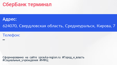 СберБанк, терминал по адресу 624070, Свердловская область, Среднеуральск, Кирова, 7 в дальнейшем Организация, размещена в следующих категориях:
